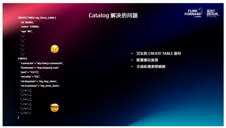 在这里我举个简单的例子,写过 SQL 的人都知道,很头疼的一件事就是去写 CREATE TABLE ,我们需要给每一个字段去定义它的类型和名字,比如说我在读取它的上游表,这个表里面定义的字段上百个,这是非常常见的情况,需要一一把它映射到 Flink 的数据类型里面,然后把它罗列在列定义里。除此之外,我们还需要为 Table 写 With 参数,指定 Connector ,配置这个 Connector。某些 Connector 的配置非常复杂,比如说连接一个开启了 SSL 的 Kafka 集群,可能需要写很多的参数才可以把这个 Table 创建出来,这就是我们遇到的第一个问题:CREATE TABLE 语句太冗长了。