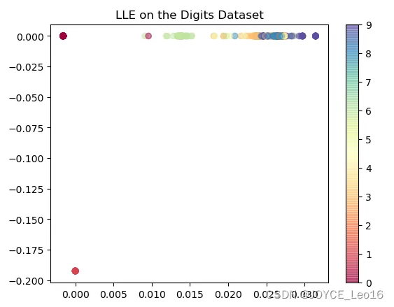 from sklearn.manifold import LocallyLinearEmbedding # 应用LLE降维 lle = LocallyLinearEmbedding(n_components=2) X_lle = lle.fit_transform(X) # 可视化结果 plt.scatter(X_lle[:, 0], X_lle[:, 1], c=digits.target, cmap='Spectral', alpha=0.5) plt.colorbar() plt.title("LLE on the Digits Dataset") plt.show()
