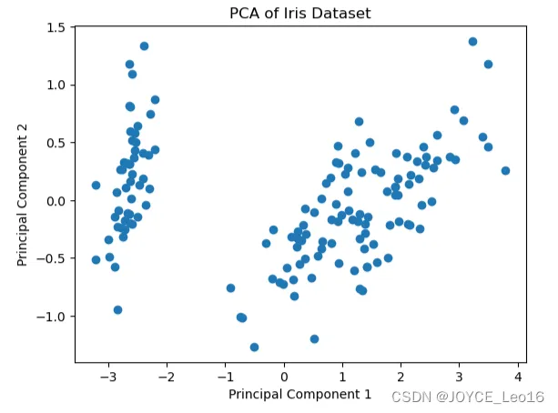 from sklearn.decomposition import PCA from sklearn.datasets import load_iris import matplotlib.pyplot as plt # 加载数据集 data = load_iris() X = data.data # 应用PCA pca = PCA(n_components=2) # 降到2维 X_pca = pca.fit_transform(X) # 可视化结果 plt.scatter(X_pca[:, 0], X_pca[:, 1]) plt.xlabel('Principal Component 1') plt.ylabel('Principal Component 2') plt.title('PCA of Iris Dataset') plt.show()