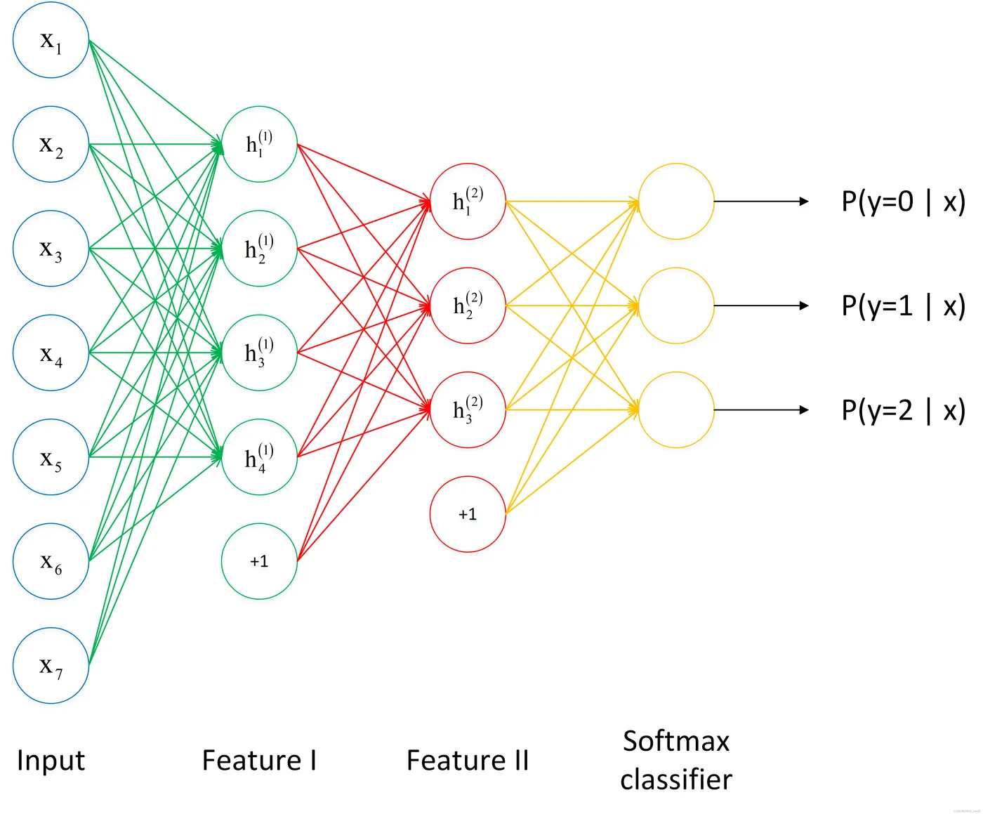 从下图看,神经网络中包含了输入层,然后通过两个特征层处理,最后通过softmax分析器就能得到不同条件下的概率,这里需要分成三个类别,最终会得到 的概率值。