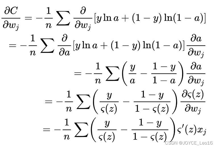 综上所述,交叉熵是非负的,在神经元达到很好的正确率的时候会接近 0。这些其实就是我们想要的代价函数的特性。其实这些特性也是⼆次代价函数具备的。所以,交叉熵就是很好的选择了。但是交叉熵代价函数有⼀个⽐⼆次代价函数更好的特性就是它避免了学习速度下降的问题。为了弄清楚这个情况,我们来算算交叉熵函数关于权重的偏导数。我们将a=ς(z)a={\varsigma}(z)代⼊到 公式中应⽤两次链式法则,得到:
