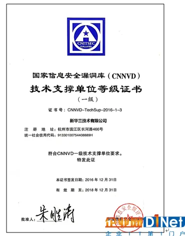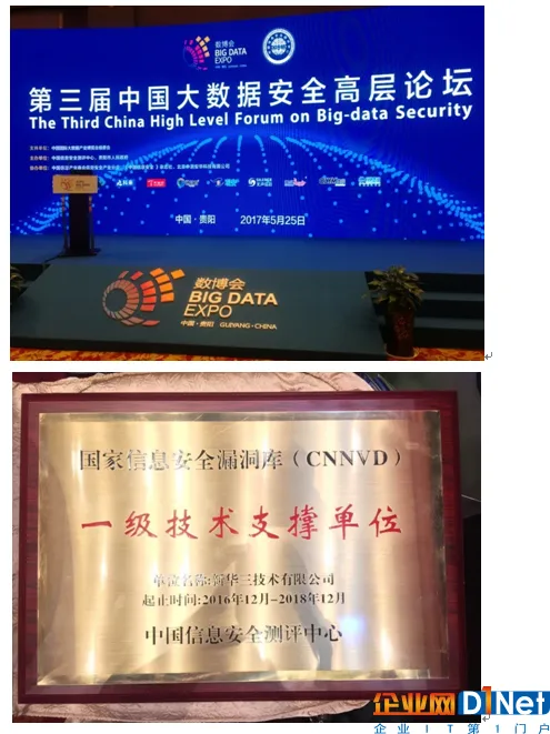 会议期间,中国信息安全测评中心、中国国家信息安全漏洞库(CNNVD)在会上为新华三集团授予“中国国家信息安全漏洞库(CNNVD)一级支撑单位”奖牌。此项认证是该领域的最高级别,新华三是国内唯一具备CNNVD一级支撑单位的综合类网络安全厂商。