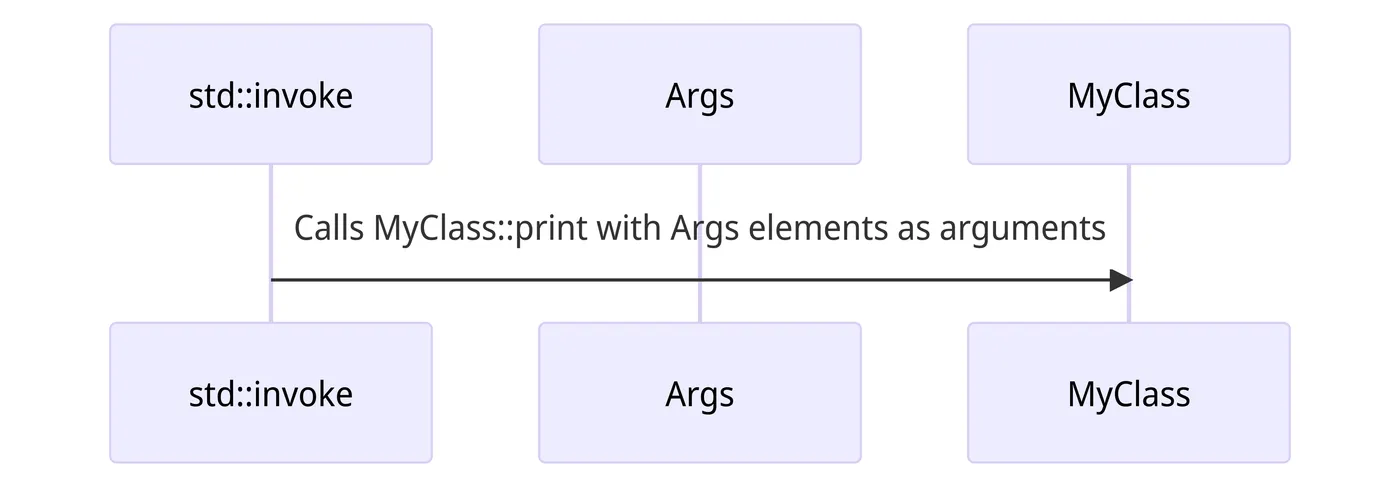 在这个序列图中,我们可以看到std::invoke是如何调用MyClass的成员函数print的。这是一个很好的例子,展示了如何使用std::invoke作为std::apply的替代方案。