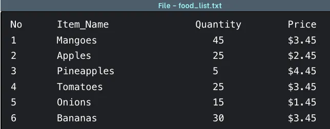 在此示例中,我们有一个名为 food_list.txt 的文件,它是不同食品的购物清单,我想通过在每行末尾添加 (**) 来标记数量小于或等于 20 的食品。