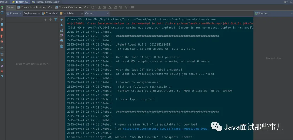 看到 Log 有 JRebel 输出的版本信息, 没有报错就是表示成功执行了, 随便改一个类试试吧