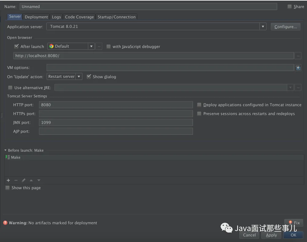 配置 Tomcat 的方法和直接上面说的直接调用配置方法一样, 同样需要注意的是 On 'Update' action 和 On frame deactivation 这两项目一定要选择 Update classes and resources, 唯一不同的是 VM options 这项不需要填, 放空就好 接下来直接启动项目, 一般选择后面那个 Debug 按钮