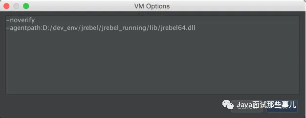 接下来就是很关键的需要引入 JRebel 的地方了, 在 VM options 的最右边有个箭头, 点进去