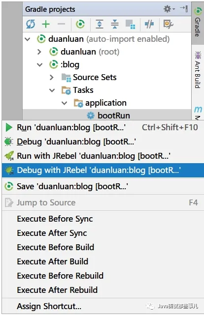 然后在 Maven projects 或 Gradle projects 窗口,右键 Task 使用 JRebel 启动