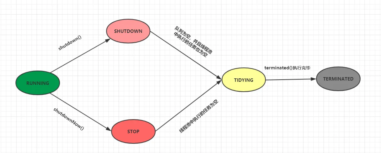 线程池有这几个状态:RUNNING,SHUTDOWN,STOP,TIDYING,TERMINATED。