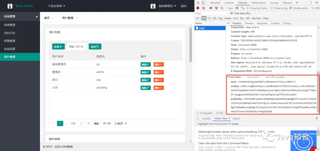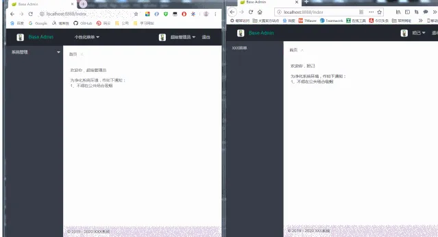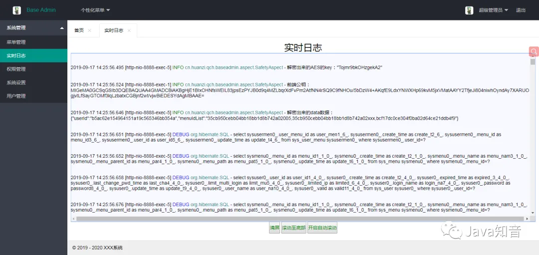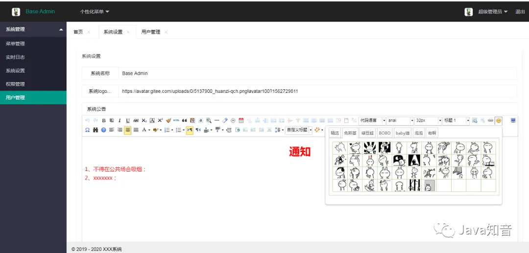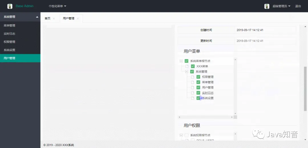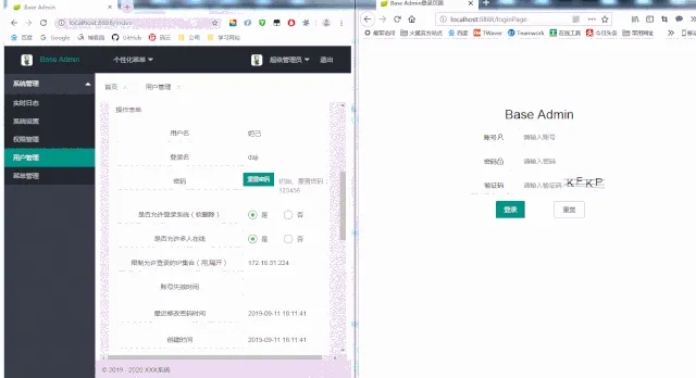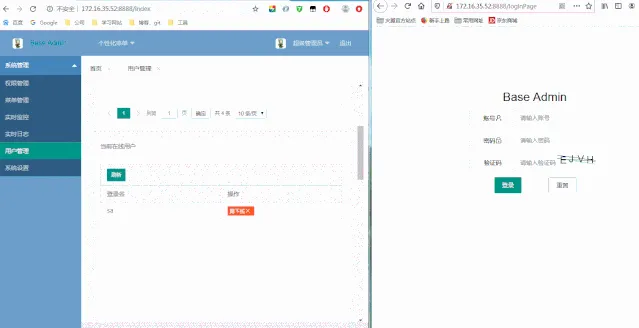 这套Base Admin是一套简单通用的后台管理系统,主要功能有:权限管理、菜单管理、用户管理,系统设置、实时日志,实时监控,API加密,以及登录用户修改密码、配置个性菜单等