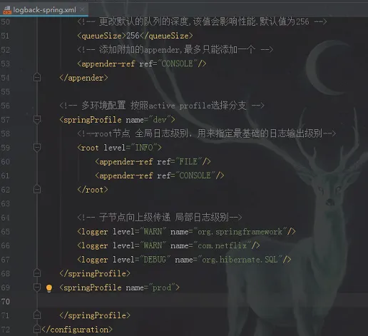 注意:这里的日志配置只配置了dev环境,prod环境尚未为空,发布生产环境前记得先配置,否则生成的日志文件将不会输入日志内容!