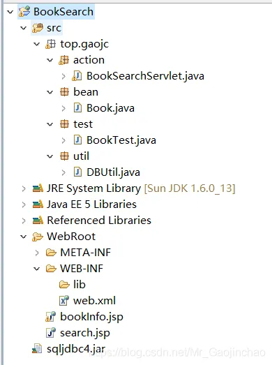 <?xml version="1.0" encoding="UTF-8"?> <web-app version="2.5" xmlns="http://java.sun.com/xml/ns/javaee" xmlns:xsi="http://www.w3.org/2001/XMLSchema-instance" xsi:schemaLocation="http://java.sun.com/xml/ns/javaee http://java.sun.com/xml/ns/javaee/web-app_2_5.xsd"> <display-name></display-name> <servlet> <description>This is the description of my J2EE component</description> <display-name>This is the display name of my J2EE component</display-name> <servlet-name>BookSearchServlet</servlet-name> <servlet-class>top.gaojc.action.BookSearchServlet</servlet-class> </servlet> <servlet-mapping> <servlet-name>BookSearchServlet</servlet-name> <url-pattern>/BookSearchServlet</url-pattern> </servlet-mapping> <welcome-file-list> <welcome-file>search.jsp</welcome-file> </welcome-file-list> </web-app>