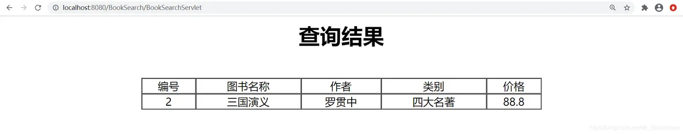 <%@page import="top.gaojc.bean.Book"%> <%@ page language="java" import="java.util.*" pageEncoding="utf-8"%> <% String path = request.getContextPath(); String basePath = request.getScheme() + "://" + request.getServerName() + ":" + request.getServerPort() + path + "/"; %> <!DOCTYPE HTML PUBLIC "-//W3C//DTD HTML 4.01 Transitional//EN"> <html> <head> <base href="<%=basePath%>"> <title>My JSP 'index.jsp' starting page</title> <meta http-equiv="pragma" content="no-cache"> <meta http-equiv="cache-control" content="no-cache"> <meta http-equiv="expires" content="0"> <meta http-equiv="keywords" content="keyword1,keyword2,keyword3"> <meta http-equiv="description" content="This is my page"> <!-- <link rel="stylesheet" type="text/css" href="styles.css"> --> </head> <body> <% // 接收Book值 Book book = (Book) request.getAttribute("book"); %> <h1 style=text-align:center;>查询结果</h1> <table border="1" cellpadding="0" cellspacing="0" align="center" width="600px"> <tr> <td><center>编号</center></td> <td><center>图书名称</center></td> <td><center>作者</center></center></td> <td><center>类别</center></td> <td><center>价格</center></td> </tr> <% if (book != null) { // 如果book的值不是空值 打印出来图书信息 out.println(book.toString() + "<br>"); } else { // 如果为空值的话继续跳转到search.jsp页面 request.getRequestDispatcher("search.jsp").forward(request,response); } %> </table> </body> </html>