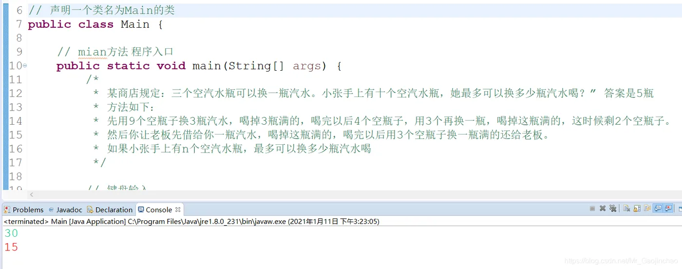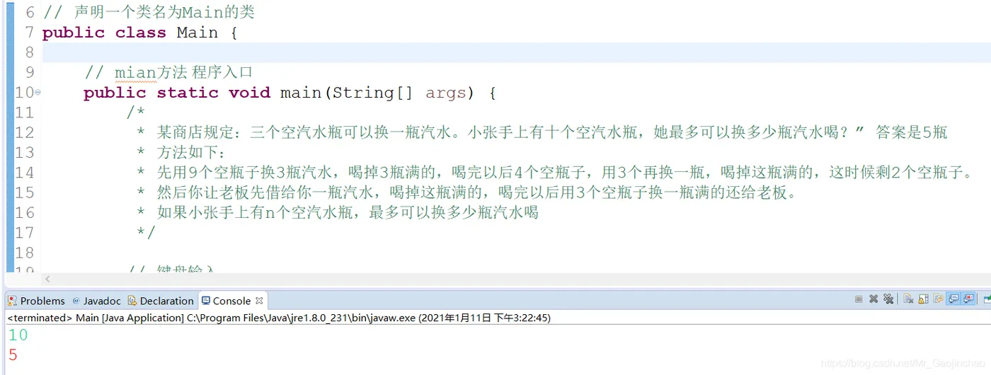 // 包名 package top.gaojc; // 导包 import java.util.Scanner; // 声明一个类名为Main的类 public class Main { // mian方法 程序入口 public static void main(String[] args) { /* * 某商店规定:三个空汽水瓶可以换一瓶汽水。小张手上有十个空汽水瓶,她最多可以换多少瓶汽水喝?” 答案是5瓶 * 方法如下: * 先用9个空瓶子换3瓶汽水,喝掉3瓶满的,喝完以后4个空瓶子,用3个再换一瓶,喝掉这瓶满的,这时候剩2个空瓶子。 * 然后你让老板先借给你一瓶汽水,喝掉这瓶满的,喝完以后用3个空瓶子换一瓶满的还给老板。 * 如果小张手上有n个空汽水瓶,最多可以换多少瓶汽水喝 */ // 键盘输入 Scanner scan = new Scanner(System.in); // 获取用户输入的空瓶子数量 int n = scan.nextInt(); // 现在手中的汽水数量 int now = 0; // 总共喝的汽水数量 int sum = 0; // 使用while循环判断 如果余下的瓶子数量大于2 则继续执行 while (n > 2) { // 换来的汽水数量 now = n / 3; // 总共喝的汽水数量 sum += now; // 重置 now = 0; // 计算剩余瓶子数量 n = n % 3 + n / 3; } // 余下的空瓶子数量如果为2 则可以再借一瓶 执行+1操作 否则直接输出总共喝的汽水数量 if (n == 2) { // 输出 System.err.println(sum + 1); } else { // 输出 System.err.println(sum); } } }