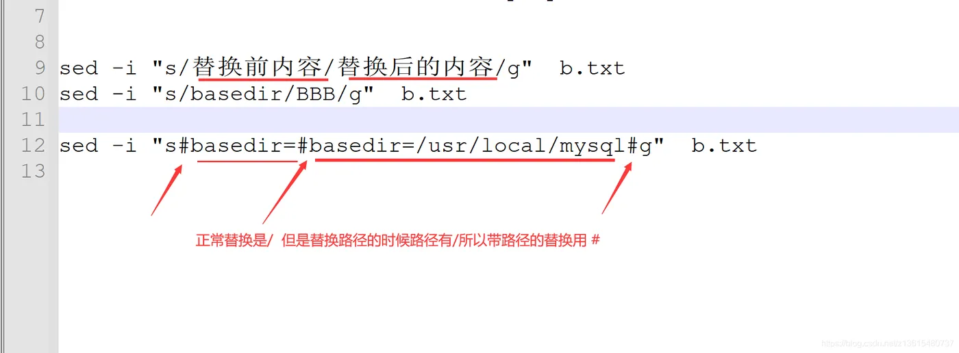 例:带路径的替换 sed -i "s#basedir=#basedir=/usr/local/mysql#g" b.txt