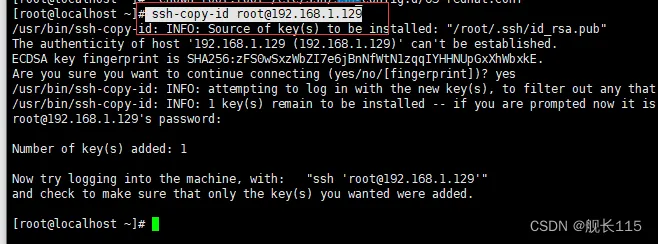 执行该命令后,需要输入B电脑129的root密码,然后将公钥添加到目标主机上的授权文件中。