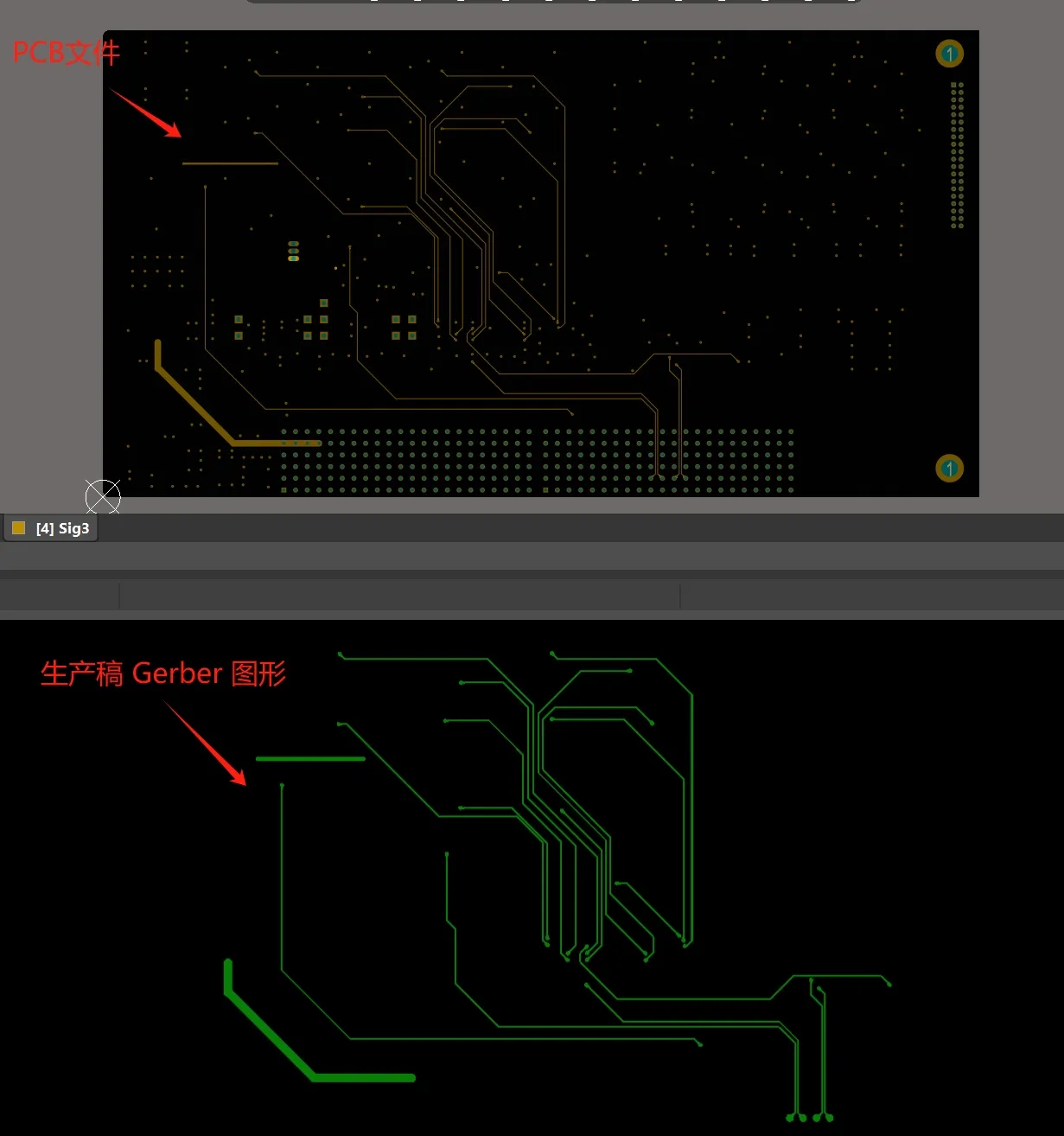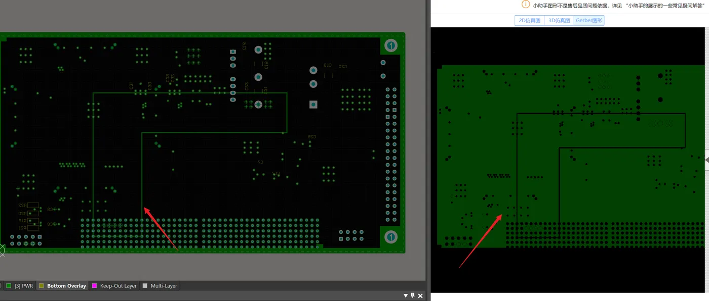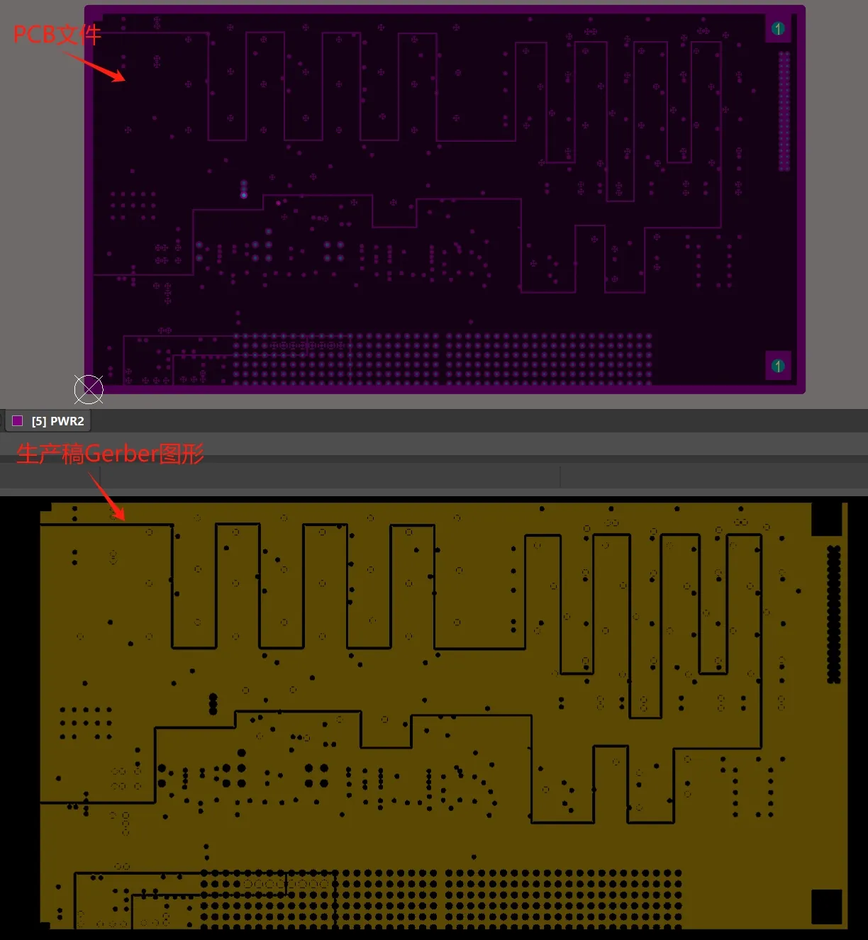 问题产生的原因是在投产 PCB 时发现生产稿的 Gerber 图形和 PCB 设计有区别,如图所示,左边为某 PCB 内层,右边为对应层生产稿的 Gerber 图形,两者图形正好相反: