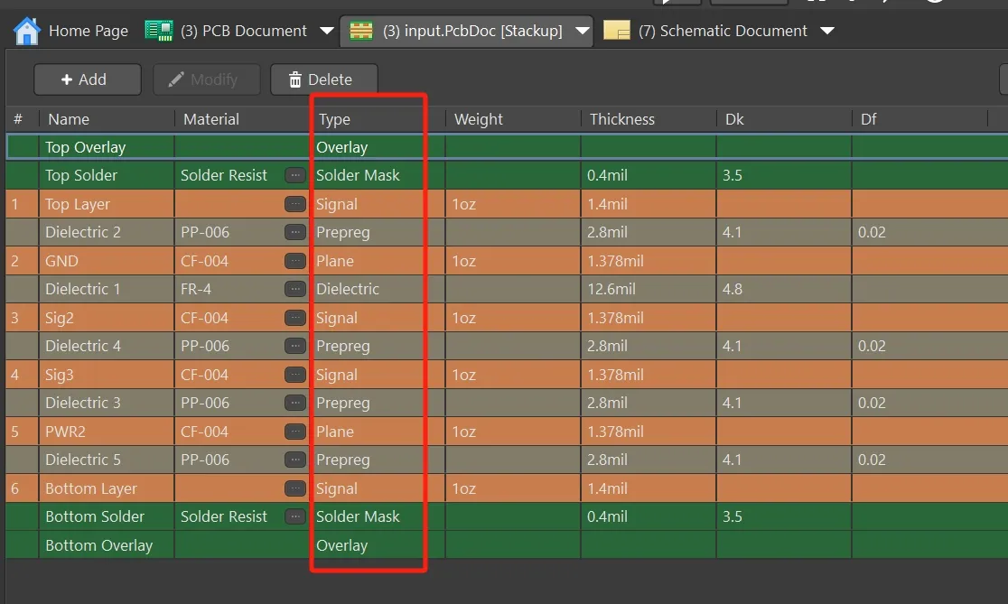 设计-->层叠管理器,可以看到 PCB 的各层属性,如Sig3配置为Signal层,PWR2配置为了Plane层: