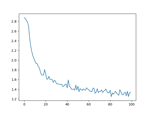 训练就像往常一样 - 多次调用 train 并等待几分钟,每print_every个示例打印当前时间和损失,并在all_losses中保留每plot_every个示例的平均损失以供稍后绘图。
