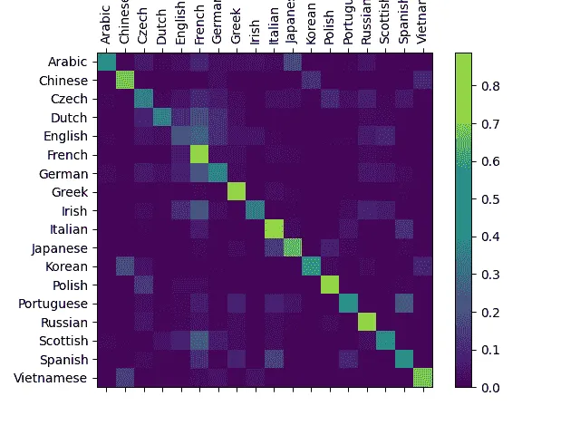 /var/lib/jenkins/workspace/intermediate_source/char_rnn_classification_tutorial.py:445: UserWarning: set_ticklabels() should only be used with a fixed number of ticks, i.e. after set_ticks() or using a FixedLocator. /var/lib/jenkins/workspace/intermediate_source/char_rnn_classification_tutorial.py:446: UserWarning: set_ticklabels() should only be used with a fixed number of ticks, i.e. after set_ticks() or using a FixedLocator.