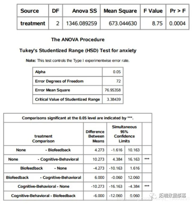 proc anova data=anova; class treatment; model anxiety = treatment; means treatment / tukey; run;