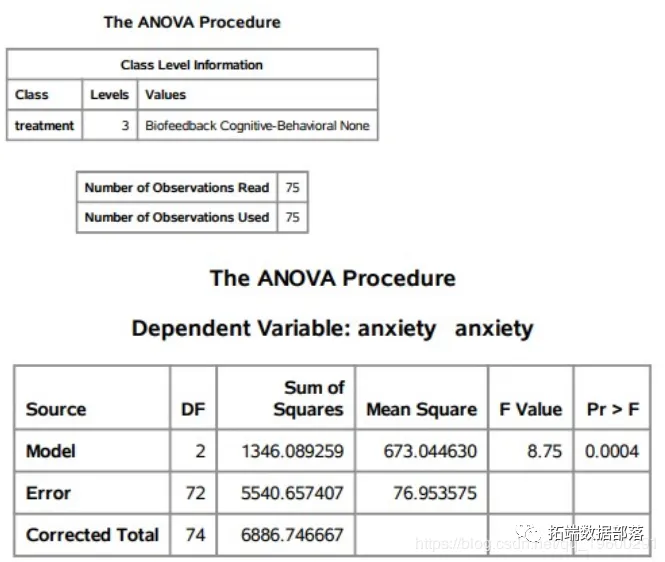 前两个表给出了类别级别变量(处理)及其可能的级别(1、2或3),以及所使用的观察次数(n=75n=75)。