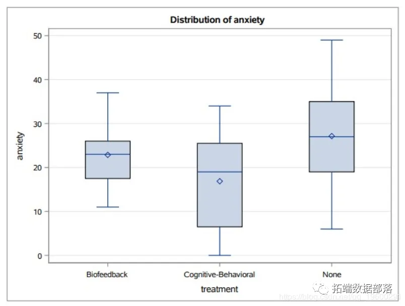 我们可以使用条形图将数据可视化,以检查组之间方差的正态性和均等性。当我们运行ANOVA时,SAS会自动打印。