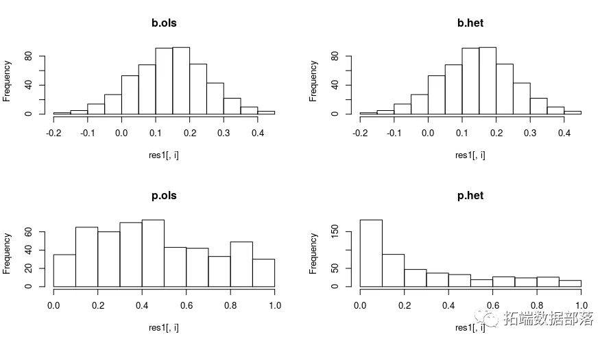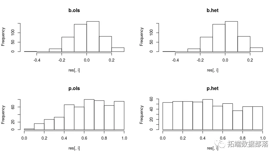 OLS和异方差性MLE的治疗效果相似。但是,当null为true时,异方差MLE模型的p值表现得更好。如果null为true,则可以期望p值均匀分布。OLS迭代的p值堆叠在高端。