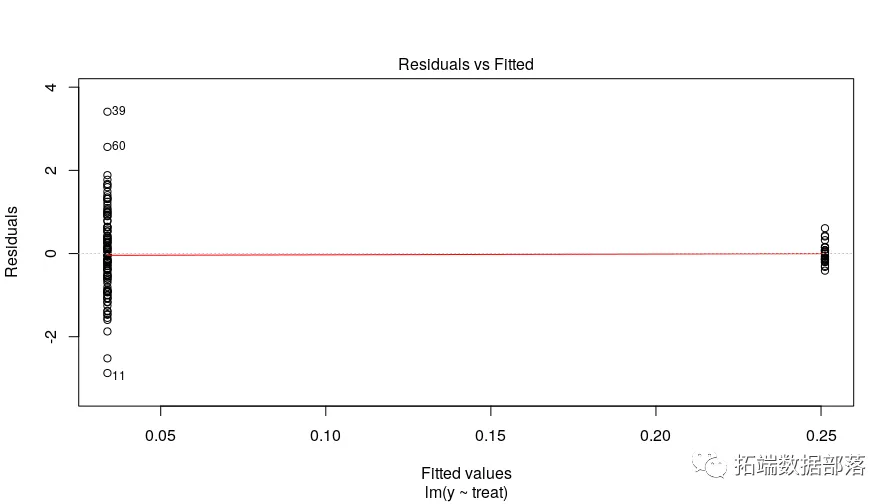 治疗效果为0.22,无统计学意义,p = 0.26p=.26在一个αα的.05级。但是我们知道方差不是同方差的,因为我们创建了数据,并且残差对拟合值的简单诊断图证实了这一点:
