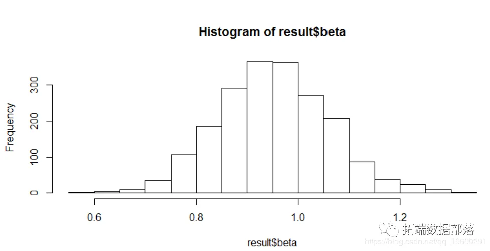 对于回归斜率β,我们的后验均值为0.95(接近用于模拟数据的真实值1)。为了形成95%的后可信区间,我们简单地采用取样后部的2.5%和97.5%的百分位数,这里是0.75到1.17。