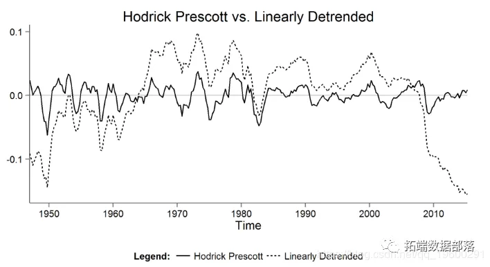 Hodrick和Prescott(1981)开发了一种滤波器,它将时间序列分为趋势,周期和噪声分量。该hpfilter功能包含在mFilter包中,需要时间序列和平滑参数。文献表明后者的值为1600。但是,也可以选择更高的值。下图显示了Hodrick-Prescott滤波器获得的实际GDP的周期性成分值,并将其与线性去趋势系列的值进行了比较。两个系列的行为看起来非常相似,只是HP系列在零附近波动较大,而线性去趋势系列仍然包含趋势的组成部分。此外,循环HP系列还包括一些类似噪音的组件。