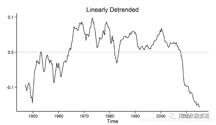 这种方法相对有争议,因为它假设存在一个恒定的线性时间趋势。正如我们上面所看到的,鉴于趋势增长率随时间的稳步下降,这种情况不太可能发生。然而,仍然可以假设时间趋势的不同函数形式,例如添加二次项,以摆脱趋势。这种方法的另一个缺点是它只能排除趋势,而不能排除噪声,即系列中的非常小的波动。