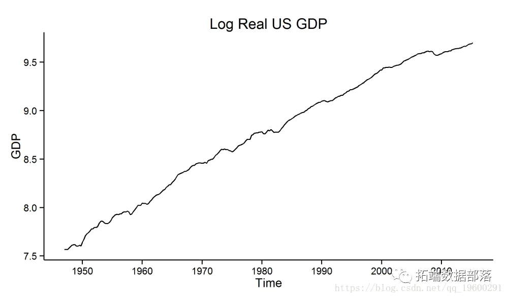 names(gdp) <- c("Time","GDP") # Rename variables gdp[,"GDP"] <- log(gdp[,"GDP"]) # Take logs
