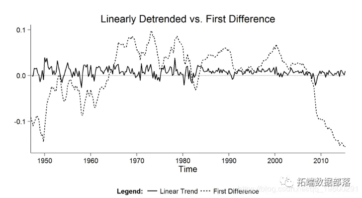 g <- melt(dat,id.vars="Time",na.rm=TRUE) levels(g[,2]) <- c("Linear Trend","First Difference") #定义画图函数 plot.cycles <- function(d,t) { axis.line=element_line(size=.3,colour="black"), # axis.text=element_text(colour="black"), # panel.grid=element_blank()) # } # 画图 plot.cycles(d=g,t="Linearly Detrended vs. First Difference")