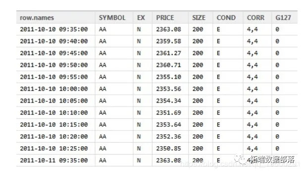 colnames(sample_tdataraw)=c(" ","SYMBOL","EX","PRICE","SIZE","COND","CORR","G127")