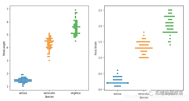 Swarmplot另一个解决stripplot中点重叠的办法就是绘制swarmplot,它的本质就是用通过算法,在类别坐标轴的方向上去‘延展’绘制这些原本重合的点。我们将纸鸢花数据集中不同种类花的petal length和petal width做swarmplot可视化。