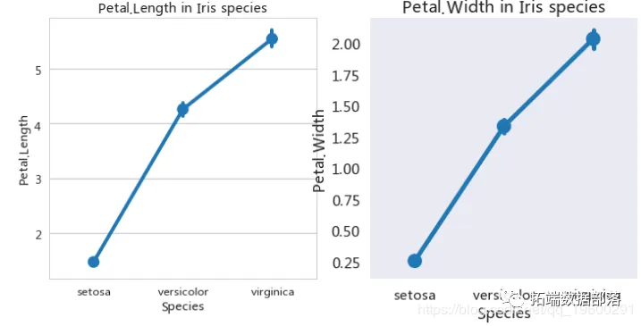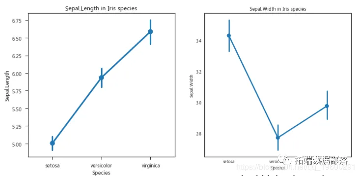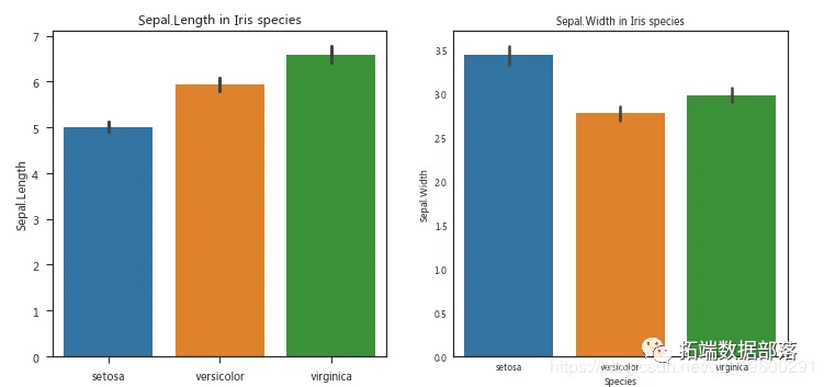 BarplotBarplot主要是展现在分类中的quantitative变量的平均值情况,并且用了boostrapping算法计算了估计值的置信区间和error bar.用鸢尾花数据集展示如下: