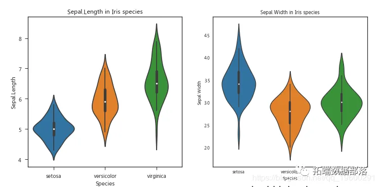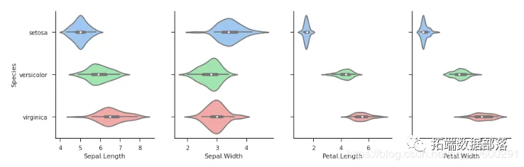 Violinplot相当于结合了箱形图与核密度图,更好地展现出数据的量化形态。展示如下: