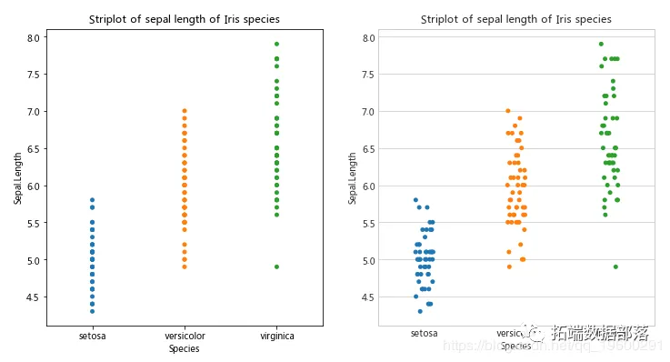 上边左侧的图片便是在默认风格下用stripplot绘制的散点图。在很多情况下,stripplot中的点会重叠,使得我们不容易看出点的分布情况。一个简单的解决办法就是用在stripplot的基础上绘制抖动图(jitterplot),仅沿着类别坐标轴的方向去随机微调整点的位置,显示出分布情况。