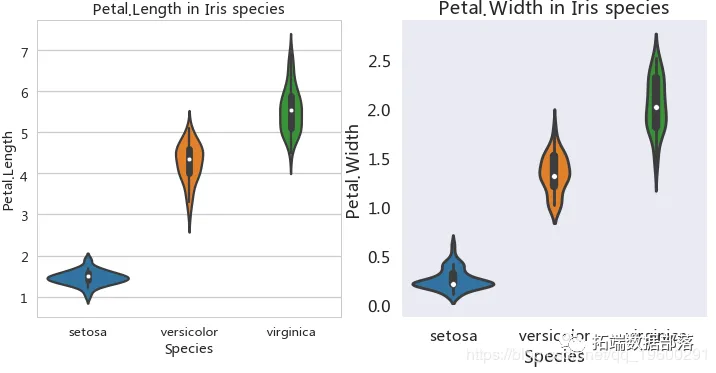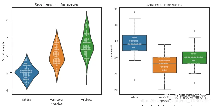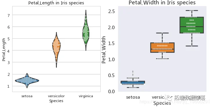 与此同时,也可以组合swarmplot和boxplot或violinplot去描述quantitative变量。用鸢尾花数据集展示如下: