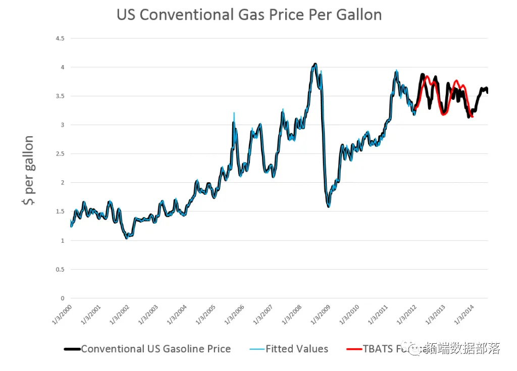 我从FRED那里抓住了传统的每周美国汽油价格。在查看之前的数据后,我确定了2000年第一周的开始日期。然后,我在Hyndman R Forecast软件包中使用了tbats(),以便在开源矩阵编程语言R中使用。