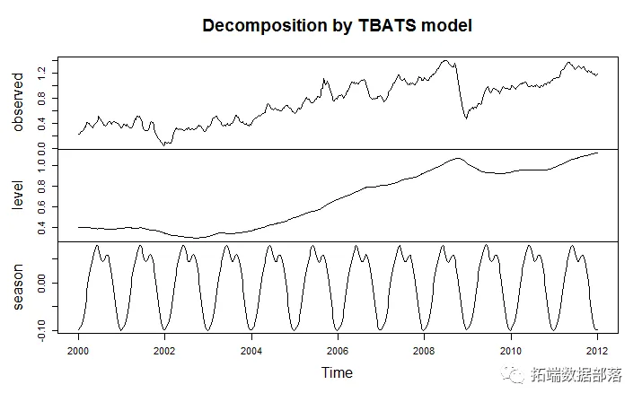 我只是分析天然气价格数据的一部分,因为我还没有接受每日数据。但是每周数据中由tbats(。)识别的季节性模式很有趣,如下所示。