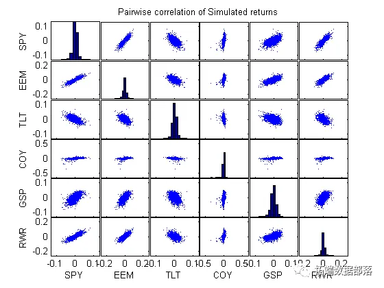 %样本组合组件权重 wts = [.1 .2 .3 .2 .1 .1]'; %从模拟组件返回生成组合返回 portReturns = R * wts; %计算VaR var = -prctile(portReturns,1); cvar = -mean(portReturns(portReturns <-var)); %与正态分布比较 R2 = mvnrnd(mean(returns),cov(returns),10000); normReturns = R2 * wts; var2 = -prctile(normReturns,1); cvar2 = -mean(normReturns(normReturns <-var2)); disp('Copula Value-at-Risk ----------------------'); fprintf('99 %% VaR:%0.2f %% \ n99 %% CVaR:%0.2f %% \ n \ n',var * 100,cvar * 100); disp('多变量正常风险值---------'); fprintf('99 %% VaR:%0.2f %% \ n99 %% CVaR:%0.2f %% \ n \ n',var2 * 100,cvar2 * 100); Copula风险价值---------------------- 99%的风险价值:1.78% 99%CVaR:2.58% 多变量正常风险值--------- 99%VaR:1.49% 99%CVaR:1.71%