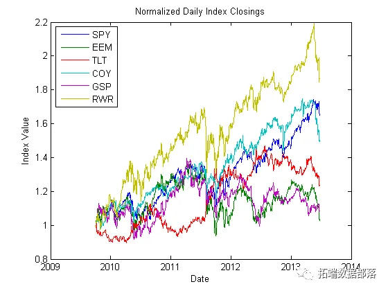 names = { 'SPY','EEM','TLT','COY','GSP','RWR' }; startPeriod = '2009-10-01' ; endPeriod = '2013-06-24' ; [date,prices,ds] = importFeedPrices(names,startPeriod,endPeriod);