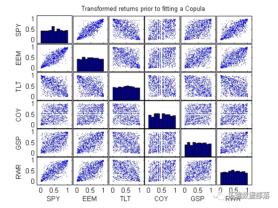 统计工具箱软件提供了两种在copula校准的技术:以下代码段首先通过上面导出的分段半参数CDF将每日居中的回报转换为均匀变量。然后它将Gaussian和t copula拟合到转换后的数据: