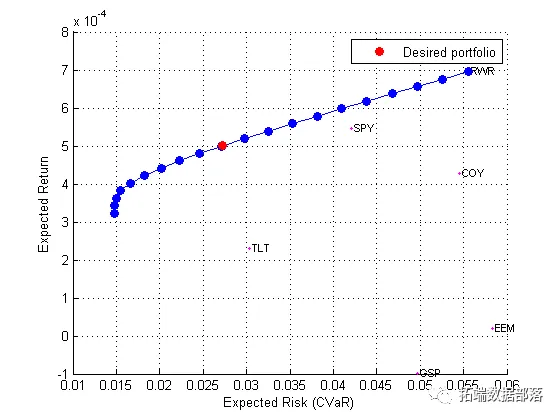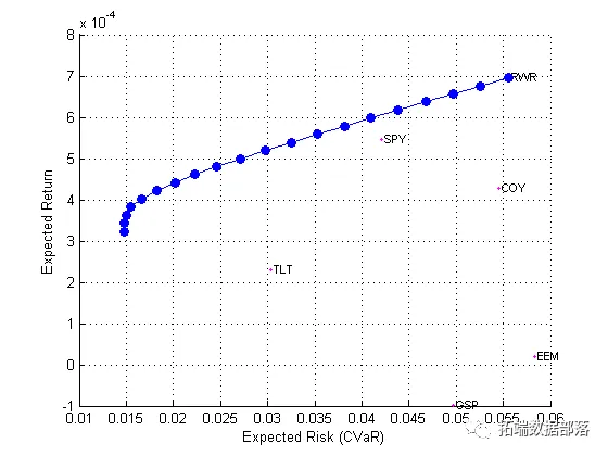 p = PortfolioCVaR('ProbabilityLevel',。99,'AssetNames',名称); p = p.setScenarios(R); portRet = p.estimatePortReturn(wts); CLF visualizeFrontier(p,portRisk,portRet);
