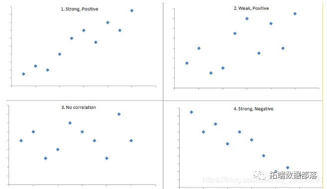 下图显示了四个假设情景,其中一个连续变量沿着X轴绘制,另一个沿着Y轴绘制。