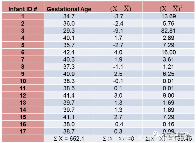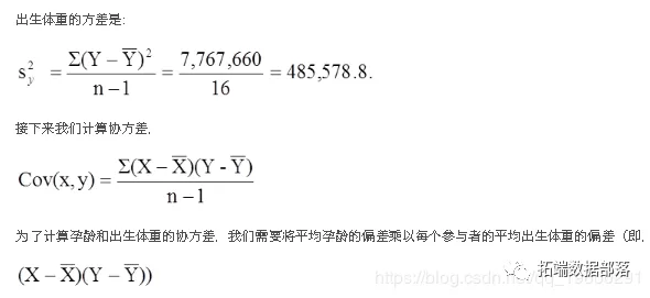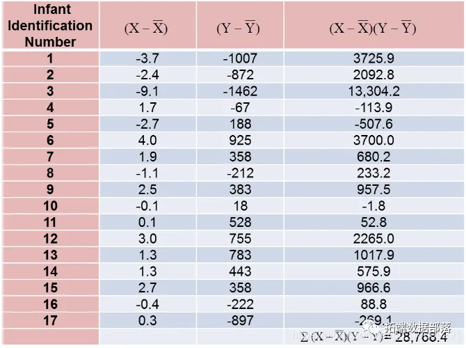 计算总结如下。请注意,我们只是简单地将平均孕龄和出生体重的偏差从上表中的两张表中复制到下表中并进行相乘。