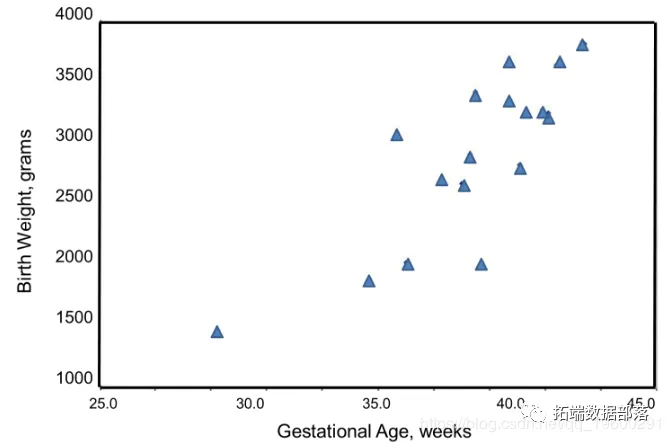 每个点代表一个(x,y)对(在这种情况下,孕周,以周为单位,出生体重以克为单位)。请注意,独立变量位于水平轴(或X轴)上,因变量位于垂直轴(或Y轴)上。散点图显示胎龄与出生体重之间存在正向或直接关联。胎龄越短的婴儿出生体重越低,胎龄越长的婴儿出生体重越高的可能性越大。