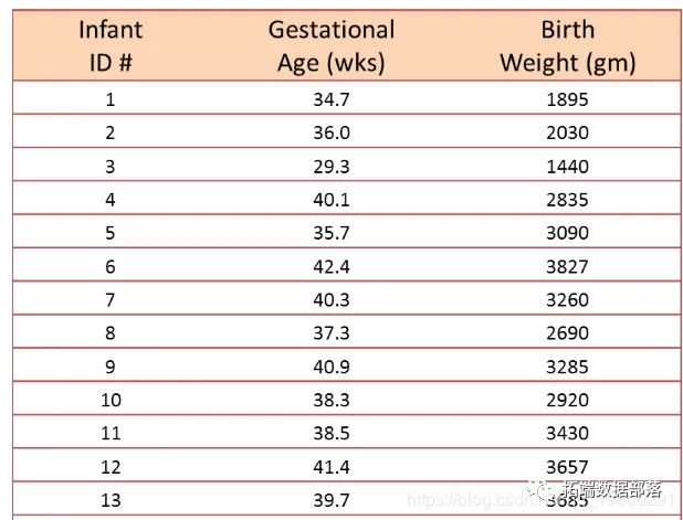 我们希望估计胎龄与婴儿出生体重之间的关系。在这个例子中,出生体重是因变量,孕龄是自变量。因此y =出生体重和x =胎龄。数据显示在下图中的散点图中。